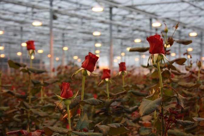 The roses are then hung at the correct sorting station and bunched in the desired bunch size. The stems of the roses are cut to one length.